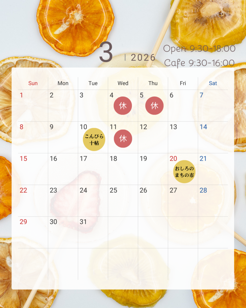 平素より五人百姓 池商店をご利用いただき、誠にありがとうございます。2026年3月の営業スケジュールをお知らせいたします。誠に勝手ながら、3月4日(水)・5日(木)・11日(水)は店休日とさせていただきます。お客様にはご迷惑をおかけいたしますが、何卒、ご理解くださいますようお願い申し上げます。
